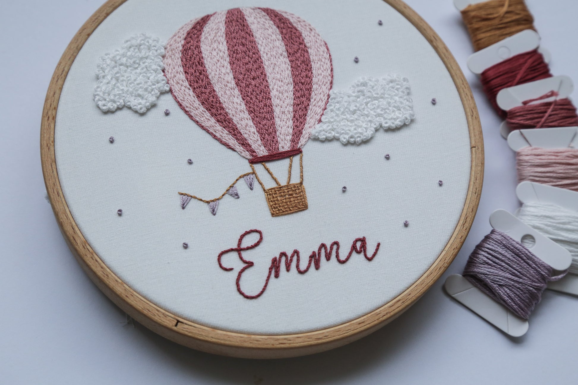 Material: 100% cotton fabric, DMC thread, quality wooden hoop
