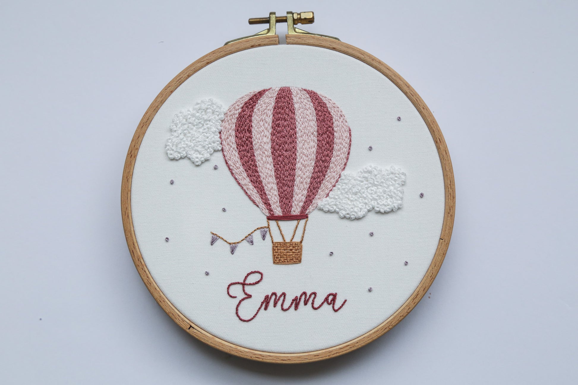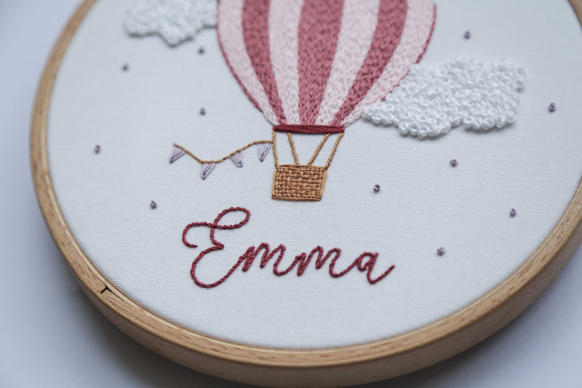 Custom name pink hot air balloon in round hoop