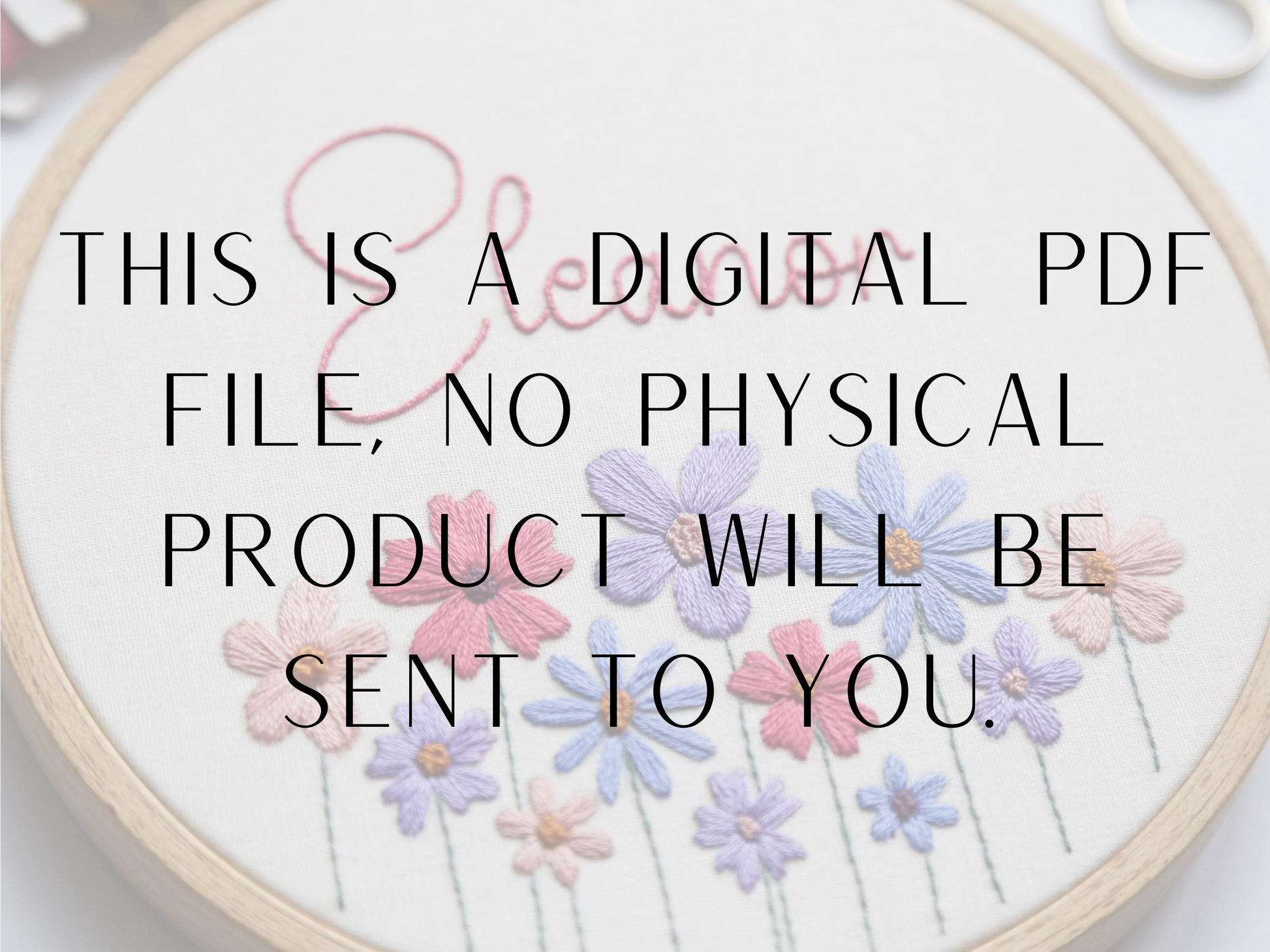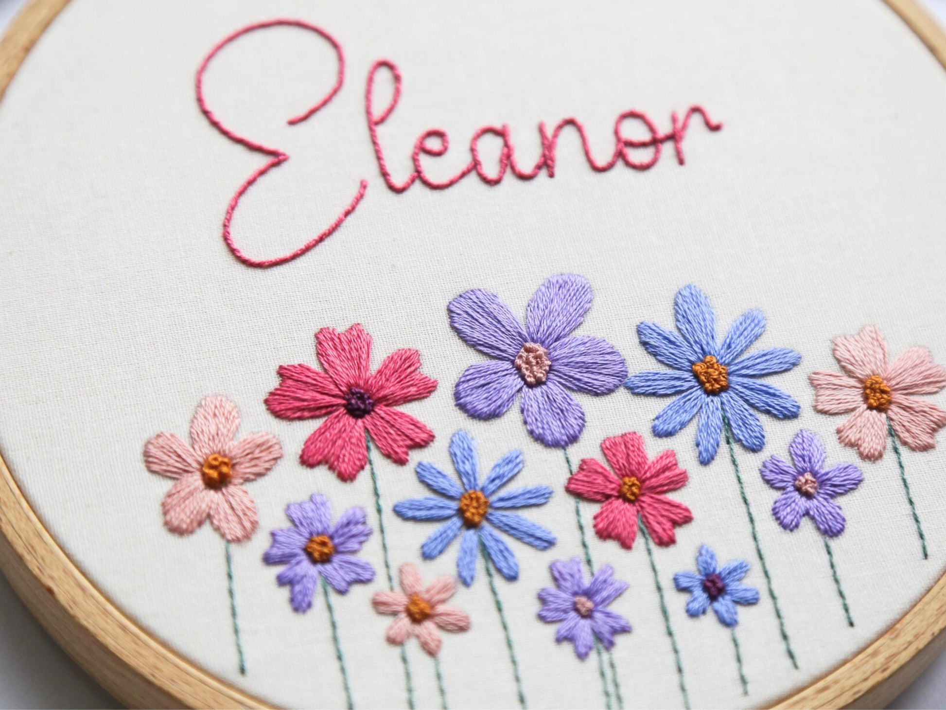 Create Your Personalized Floral Name Sign: A Unique Baby Gift or Nursery Decor Complete digital embroidery pattern featuring customizable baby's name surrounded by wildflowers Step-by-step photo instructions and stitch guide for easy completion Attractive floral design in bright pink, purple and blue Perfect as a handmade baby gift, nursery wall art, or cherished keepsake